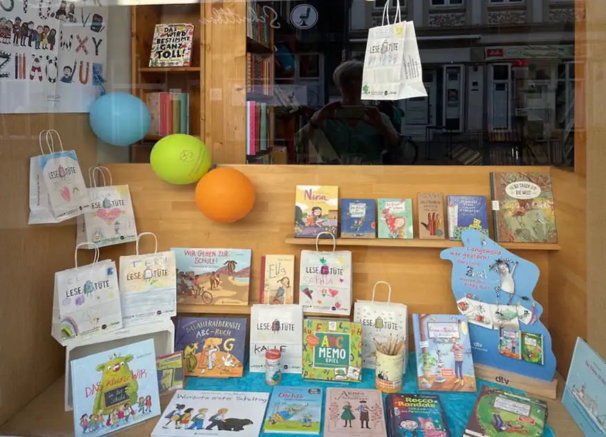 Die passenden ❗️📖 Schulbücher für alle Schulanfänger*innen haben wir im Schaufenster unserer Buchhandlung ausgestellt. Die wunderschönen bunten Lesetüten wurden von den jetzigen Schüler*innen der Stufe 1 an der Ostseeschule in Flensburg bemalt und werden dort, von uns befüllt mit einigen Überraschungen, an die Neulinge übergeben.