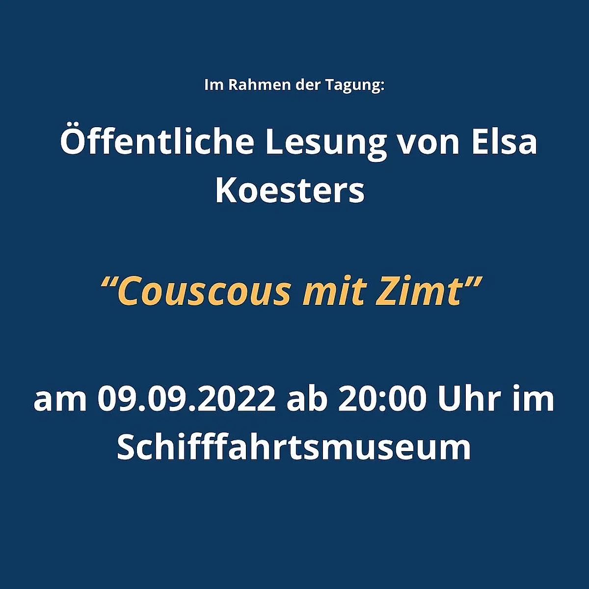 Außerdem erwartet Dich eine öffentliche Lesung von Elsa Koesters 'Couscous mit Zimt' am 09.09.2022 ab 20:00 Uhr im Schifffahrtsmuseum. Weitere Infos findest Du auf unserer Tagungshompage und im Kalender der EUF. Wir freuen uns auf Dich.