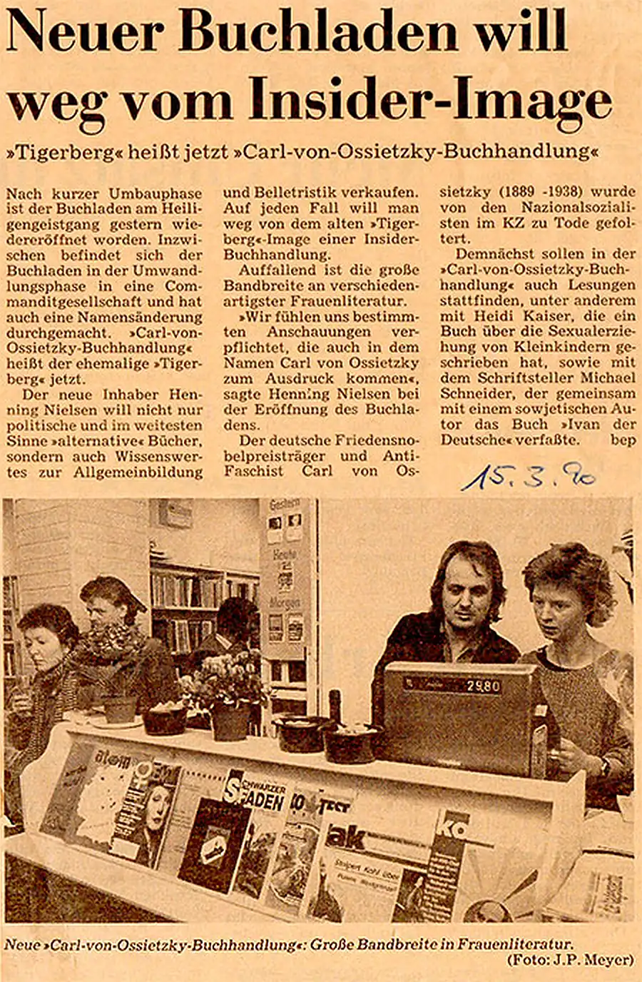 Nach kurzer Umbauphase ist der Buchladen gestern wiedereröffnet worden. Inzwischen befindet sich der Buchladen in der Umwandlungsphase in eine Commanditgesellschaft und hat auch eine Namensänderung durchgemacht. "Carl-von-Ossietzky-Buchhandlung" heißt der ehemalige "Tigerberg" jetzt.